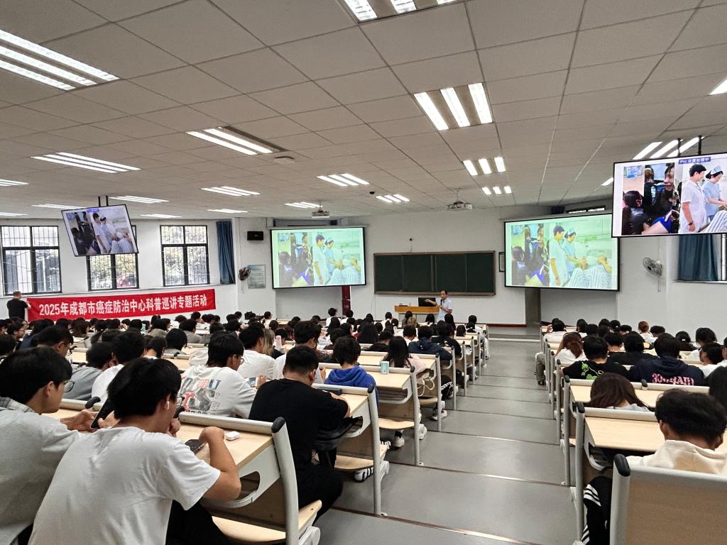 在第二环节“科学预防癌症知识普及”中,成都市第一人民医院肿瘤科李争光主任医师从“可干预的癌症风险因素”入手,用详实数据清晰阐释了吸烟、酗酒、不良饮食习惯、缺乏运动、长期熬夜等生活方式与癌症发病的密切关联。结合护理专业特点,李医生重点强调了癌症早期筛查的重要意义,系统介绍了肺癌、乳腺癌、结直肠癌等常见肿瘤的筛查方案与建议,鼓励同学们不仅要在日常生活中树立防癌意识,更要在未来临床工作中积极引导患者重视早筛早诊。
