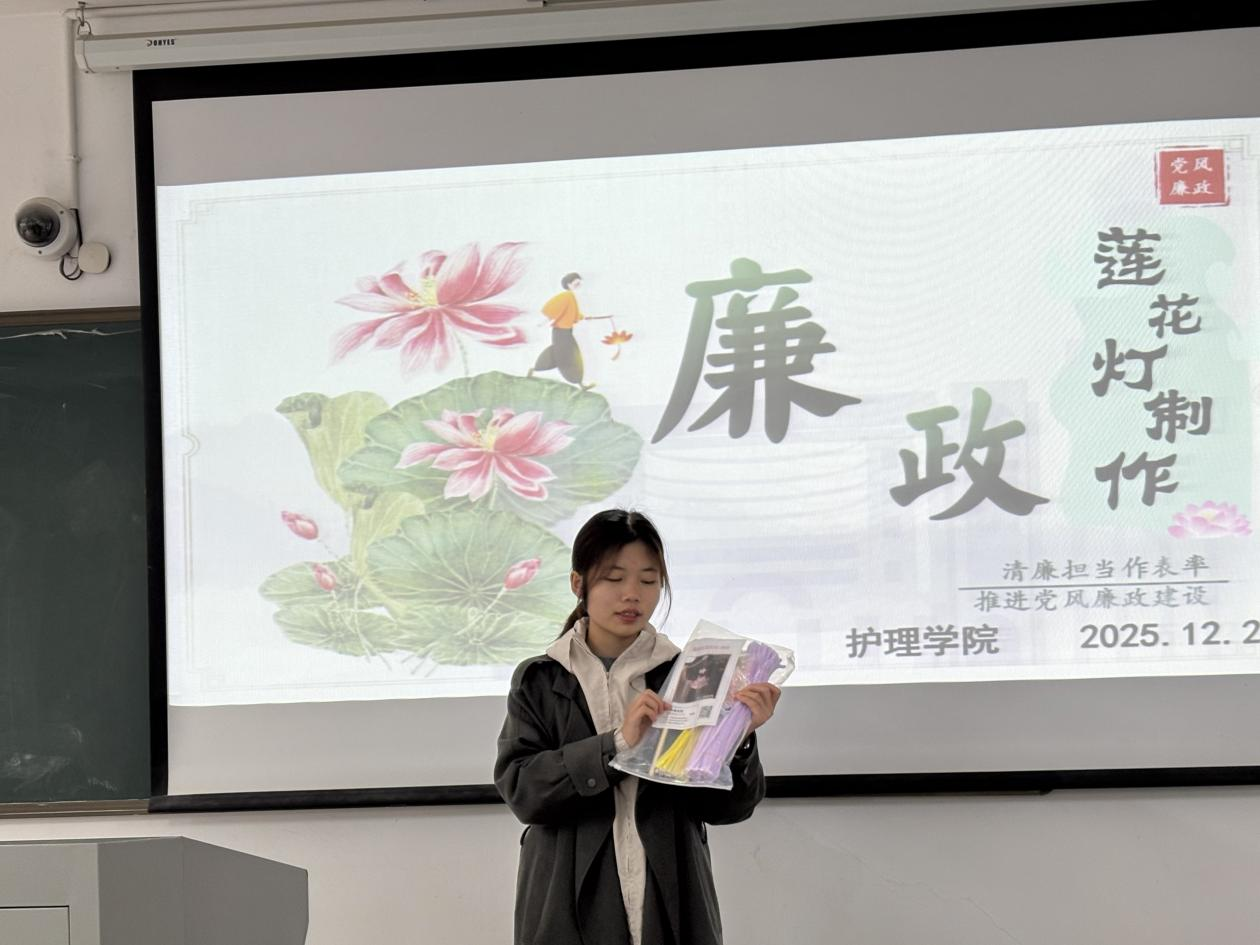 为进一步加强文明校园建设,深入推进廉洁文化建设,将廉洁种子深植青年学子心田,营造风清气正的育人环境,2025年11月27日至12月9日,护理学院成功举办了“廉韵盈心,护梦同行”主题廉洁教育系列活动。活动通过书签制作、莲花灯创作、书法比赛等丰富多元、寓教于乐的形式,吸引了全院各年级学生的广泛关注和积极参与,在学生中引发了热烈反响,取得了显著的教育实效。
