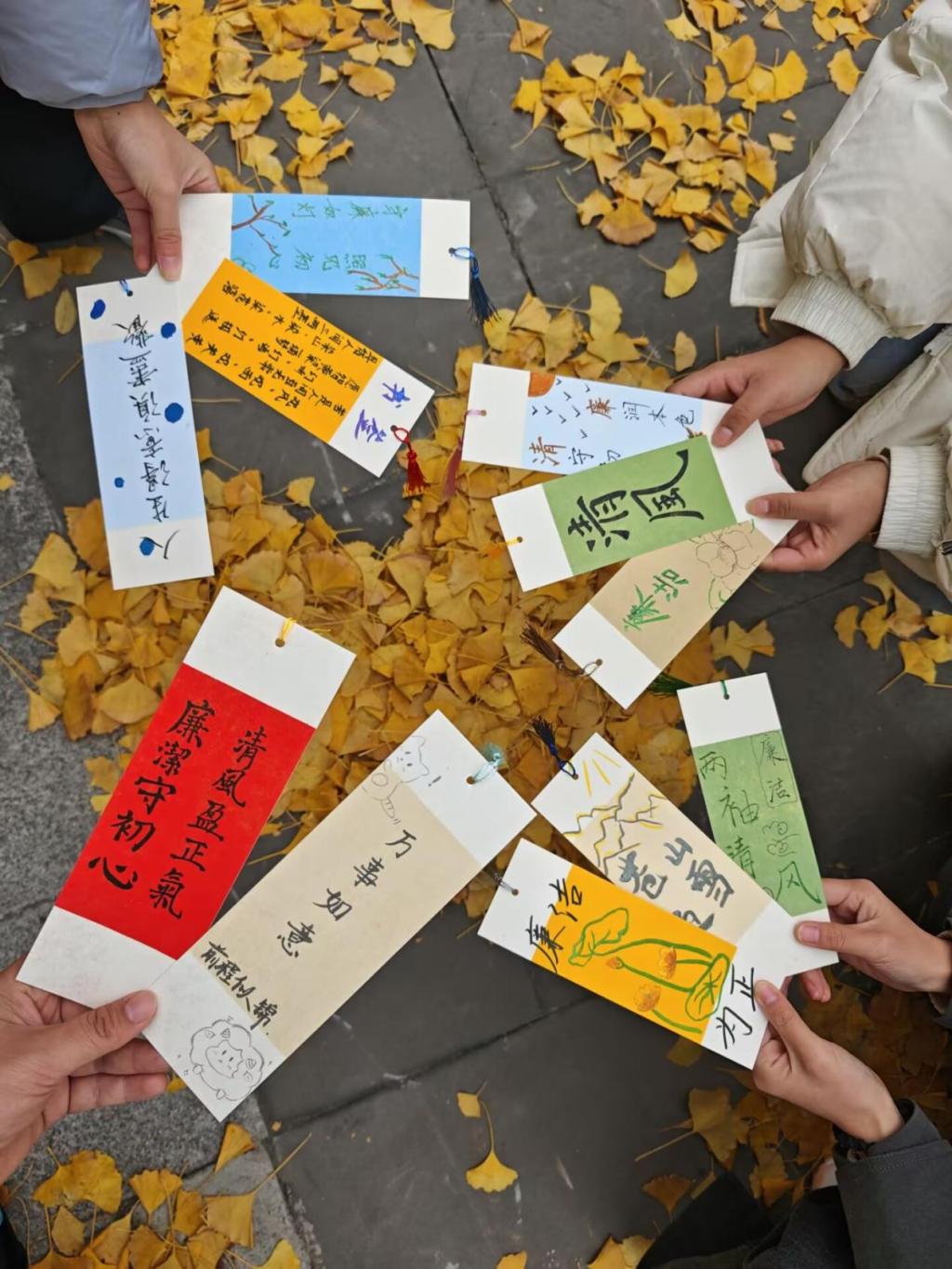 系列活动精心设计,层层递进,将廉洁教育的深刻内涵融入艺术创作与实践体验。11月27日,“巧手书廉洁,方寸映初心”书签制作活动率先启动。同学们在方寸卡纸上挥洒创意,以象征清正的图案、警醒的格言装点书签,让廉洁理念伴随书香,成为日常学习生活中的“微提醒”。