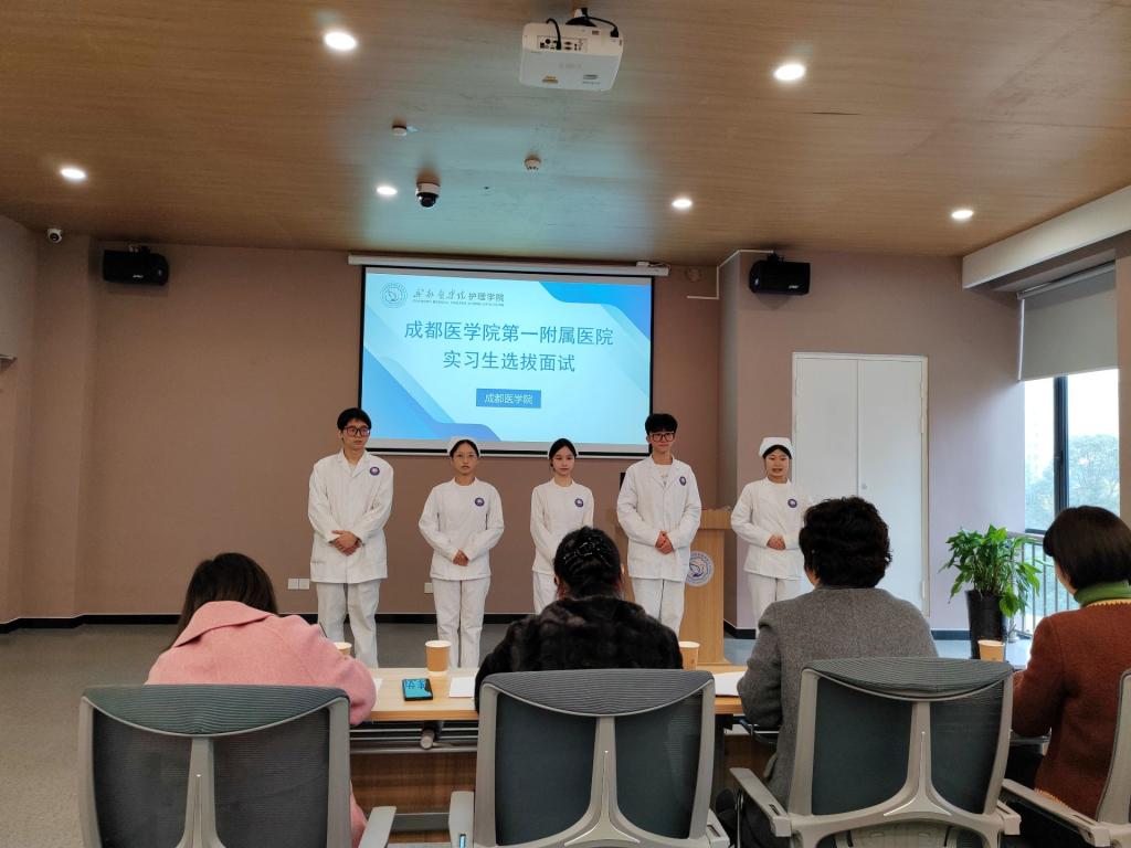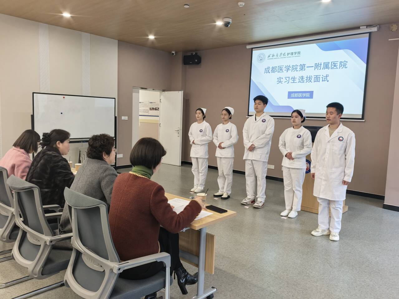 12月12日上午,成都医学院第一附属医院来校开展护理实习生面试选拔。本次面试地点在A7实验楼A305示教室,附属医院护理部张坤主任、王辉、李艳丽副主任和陈泳洁老师组成面试工作小组,重点考察学生专业基础、临床思维与沟通能力。学院党委副书记王润娟、学生科科长黄燕、2023级辅导员李欣红、李刚到场组织协调,保障面试顺利进行。