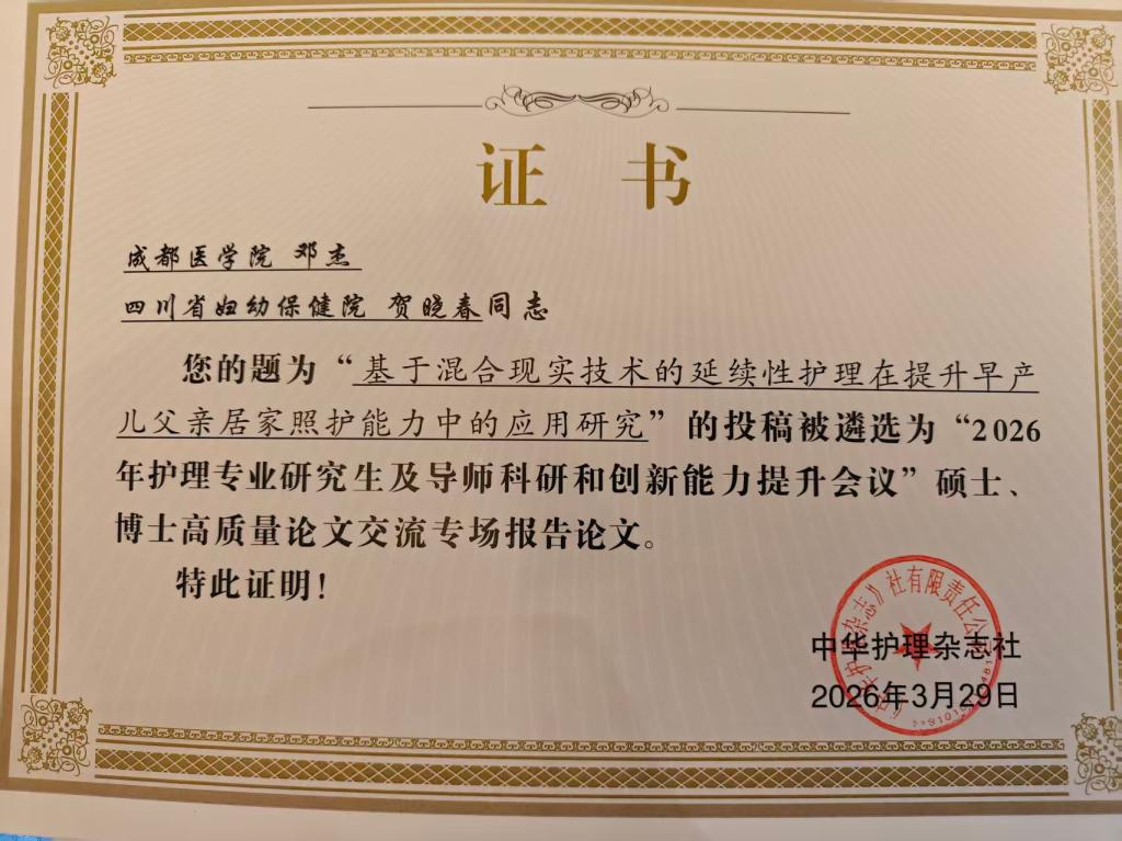 2026年3月27日至30日,由中华护理学会支持、中华护理杂志社主办的2026年护理专业研究生及导师科研和创新能力提升会议在山东济南召开。来自全国各级医疗卫生机构的护理工作者及护理院校师生共900余名代表参会。成都医学院护理学院副院长何春渝教授、张丽梅副教授带研究生邓杰参会,与全国护理领域专家及同仁共探学科发展新路径。