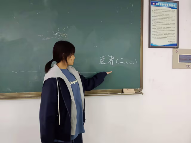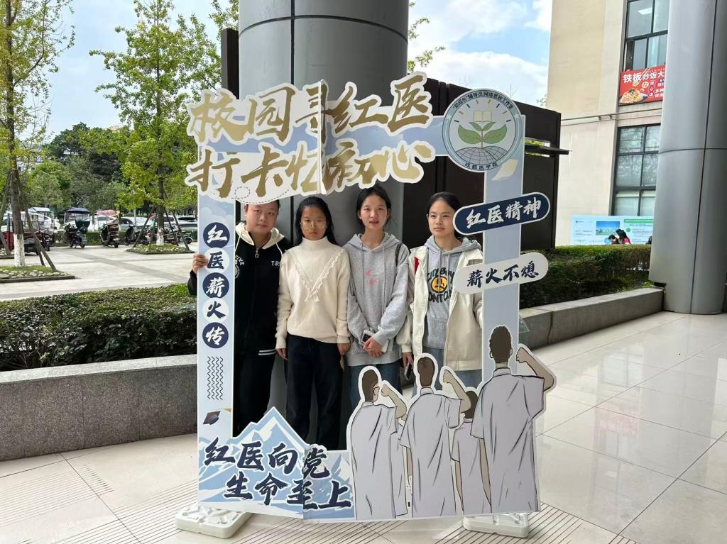 教学楼打卡围绕“知识传递”与“故事分享”展开。“知识传递”环节,打卡学生在教室黑板角落书写“医者仁心,薪火相传”“红色医者,使命在肩”等红医短句,拍照打卡传递对红医精神的敬意;“故事分享”环节,学生领取印有战地红医、抗疫医护等事迹的 “红医小卡片”,向身边同学口述故事后合影,在交流中加深对红医精神的理解。