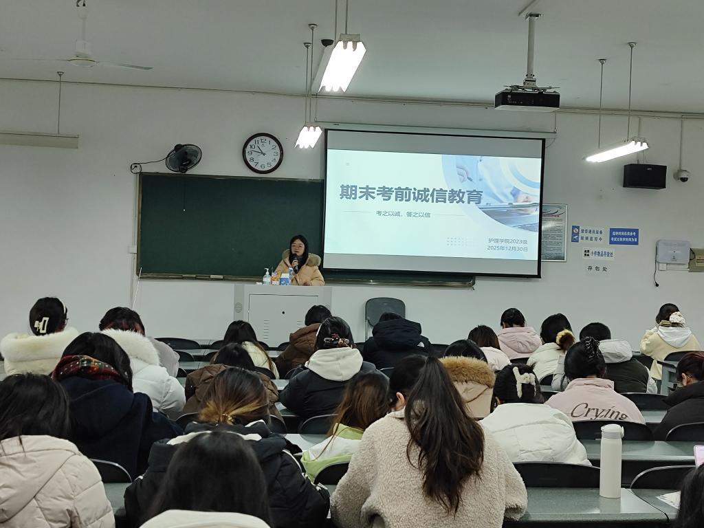 为引导同学们严肃考风考纪,增强安全意识,合理规划假期,护理学院于近日组织召开面向在校学生的期末考试诚信暨寒假假前教育主题班会。全体辅导员深入各班班级,围绕考试诚信、寒假安全与假期综合素质提升三个方面展开,旨在帮助同学们度过一个充实、安全、有意义的假期。