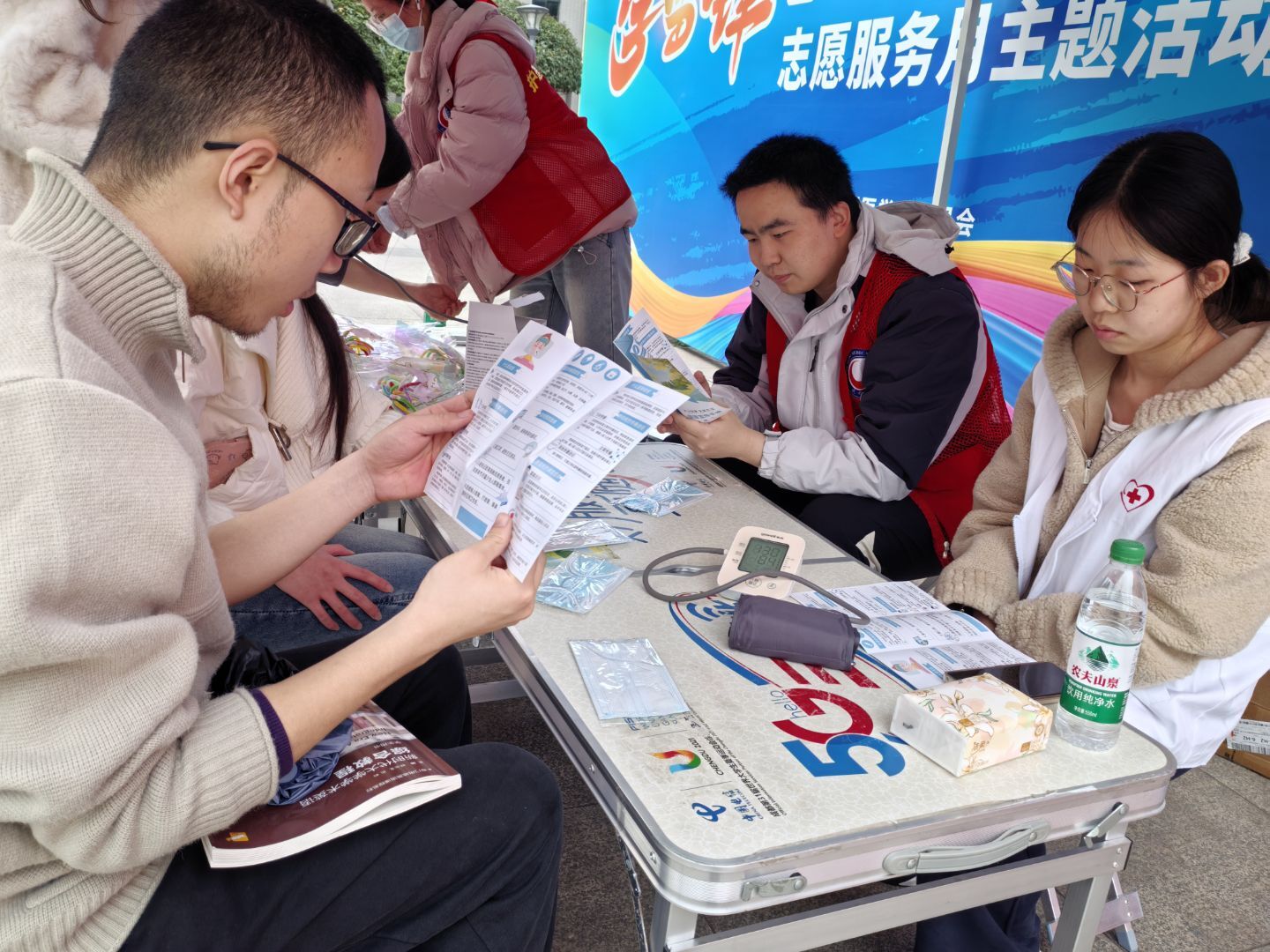 科普润心,传递健康“新”理念。志愿者们将春季传染病预防等专业知识转化为通俗易懂的生活小贴士;互动问答环节,通过“健康知识转盘”以趣味形式强化师生健康意识。从规范测量到耐心解答,志愿者们以细致服务诠释着“奉献、友爱、互助、进步”的志愿精神。