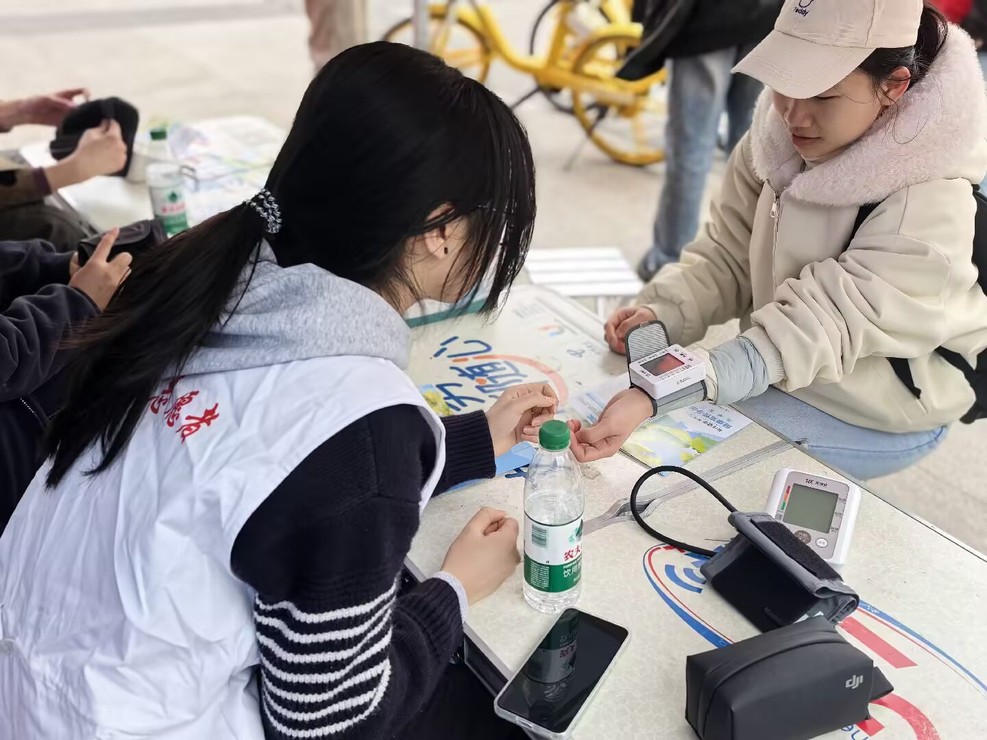 精准把脉,守护健康“心”防线。志愿者们严格遵循“三测三定”标准流程,动作娴熟地为师生监测血压,结合数据给出“少盐多动”等个性化建议,用专业筑牢健康防线。