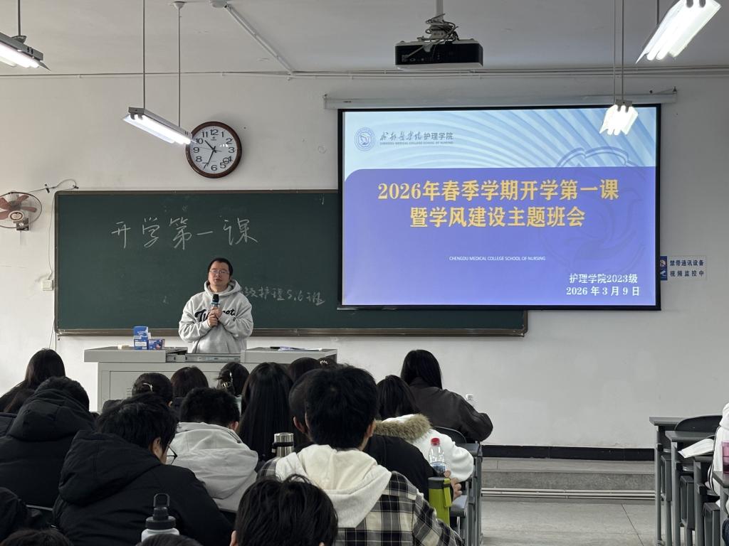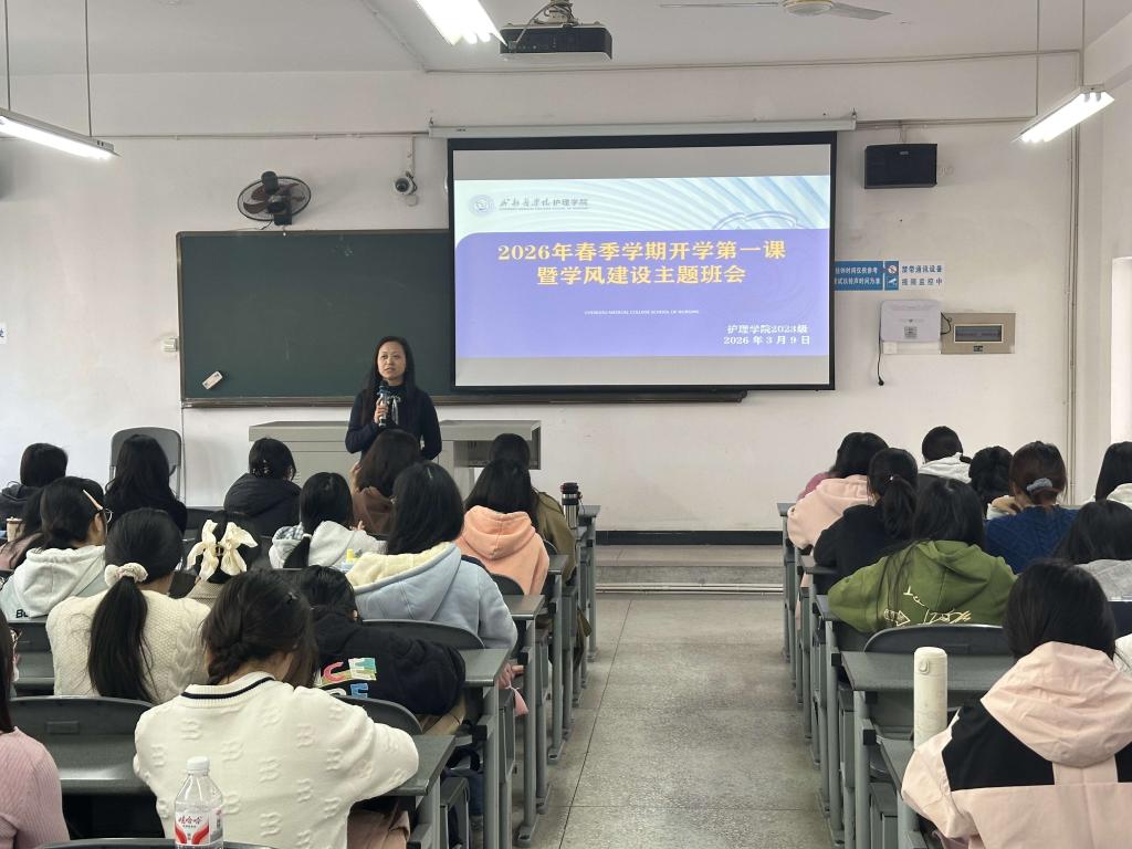 为进一步推进文明校园建设,营造“勤学、修德、明辨、笃实”的育人氛围,护理学院紧扣2026年春季学期“学风建设月”活动安排,组织开展学风建设主题班会。本次班会覆盖2023级、2024级、2025级全体在校学生,共28个班级,实现了年级、班级、学生“三个全覆盖”。班会聚焦学风建设与文明课堂、文明宿舍、文明礼仪的深度融合,结合查课、查寝、听课等常态化管理举措,推动学风建设落到实处。