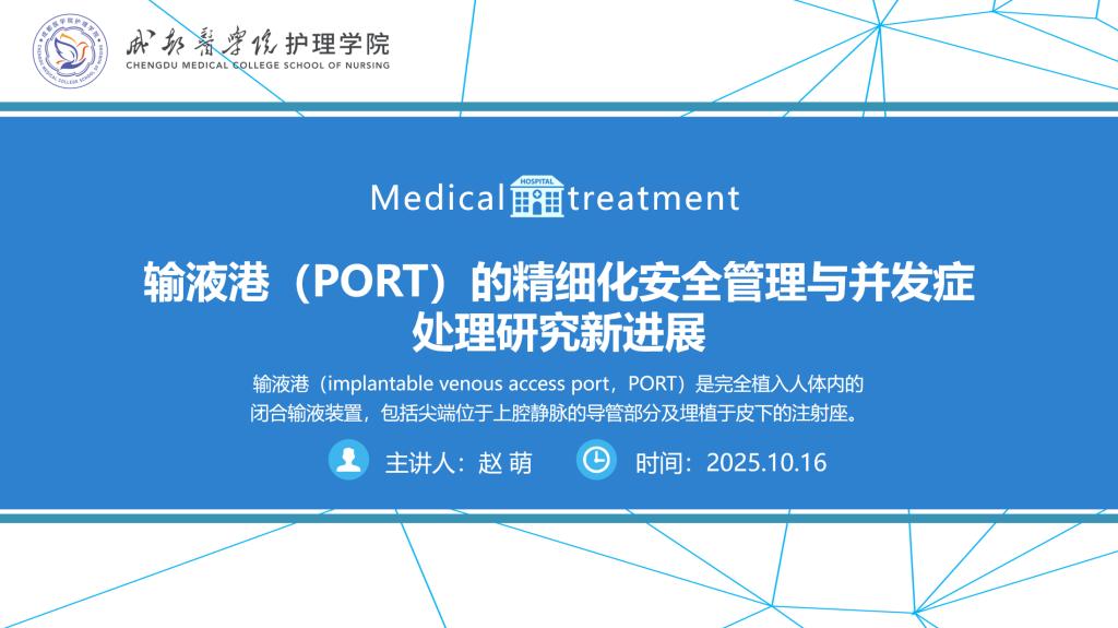 赵萌老师从循证护理的角度出发,系统梳理了输液港临床应用中的关键环节与最新研究动态。她指出,随着输液港在长期输液治疗中的广泛应用,应进一步推动精细化安全管理策略在临床落地,加强多学科协作与循证实践,同时注重护理人员对新发并发症识别与处理能力的培养,从而全面提升输液港应用的安全性与患者生活质量。