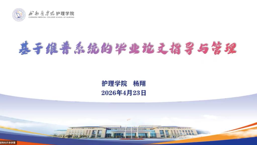2026年4月23日,护理学院举办第72期“橙”曦护理学术论坛。本期讲座题目为《基于维普系统的毕业论文指导与管理》,主讲老师为教务科科长杨翔副教授。