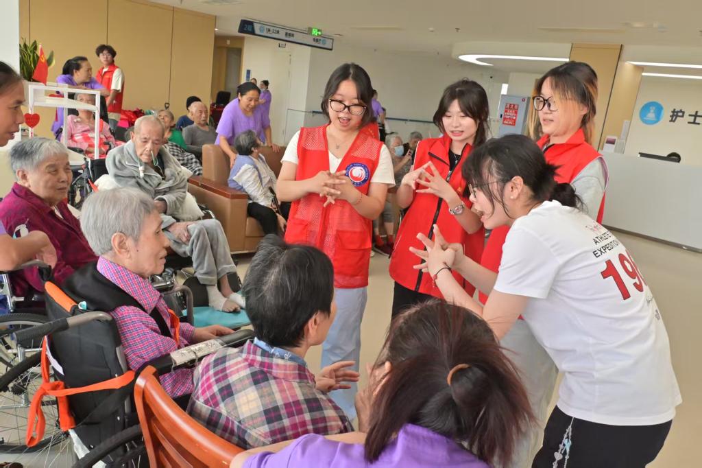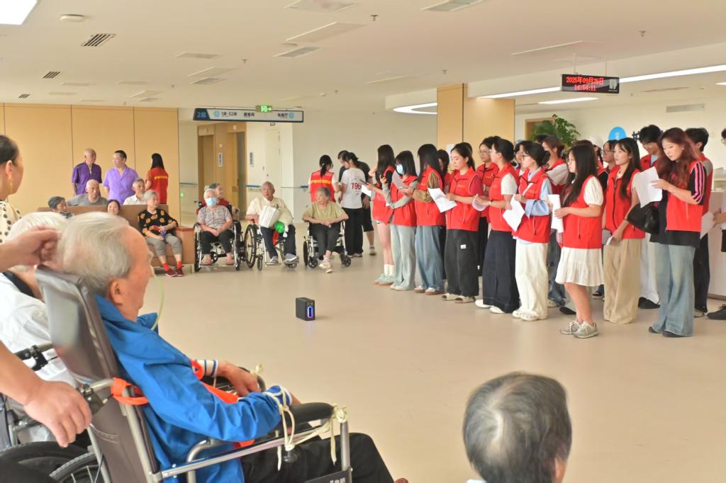 当日下午2时30分,团队在护理学院张丽梅老师带领下分别前往医院内分泌、安宁疗护和心血管内科病房。志愿者先献上《明天会更好》等经典合唱,熟悉的旋律勾起老人美好记忆,不少人轻声跟唱。随后学生们带领老人一起完成手指操,志愿者一对一引导老人“张指—握拳”,助力其促进血液循环、延缓大脑衰老,该环节也深受老人们喜欢。