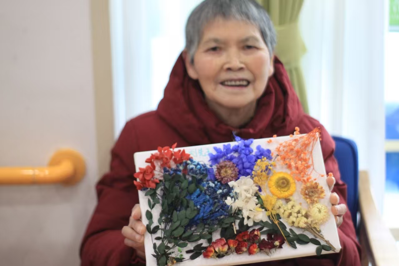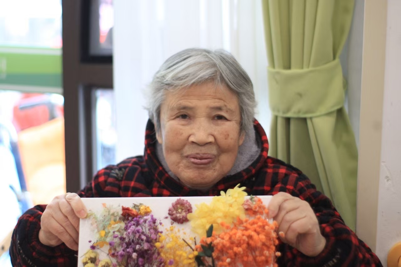 志愿者们提前购买了色彩丰富、形态各异的干花素材、环保固体胶、镊子、画框、剪刀等工具,为活动开展做好最充足的准备。同时,结合学院老年护理专业特色,还准备了简单的手部放松小技巧,方便老人在手工创作前活动筋骨,缓解紧张。活动开始后,志愿者通过简单易懂的讲解,向老人们介绍了干花的特性、干花画的创作技巧、注意事项,用提前准备的干花画作品展示,帮助老人们构思创作灵感,告诉大家“艺术源于生活,无需追求完美,随心搭配就是最好的作品”,鼓励老人们大胆创意。老人们兴致高昂,小心翼翼地挑选干花素材,认真搭配构图,发挥对晚年生活的美好想象,努力用干枯却依旧明艳的花草在画纸上缓缓勾勒出独一无二的图案。志愿者们则陪在身旁,一边协助干花画的胶粘,一边倾听老人讲述过去的平凡故事,轻声回应着岁月沉淀的智慧与温情,在一片欢声笑语中一件件让人喜爱的干花画作悄然绽放。当老人们举着自己的作品,开心和快乐写满脸庞,幸福在这一刻变得无比具象,也让现场每个志愿者内心感到非常温暖。